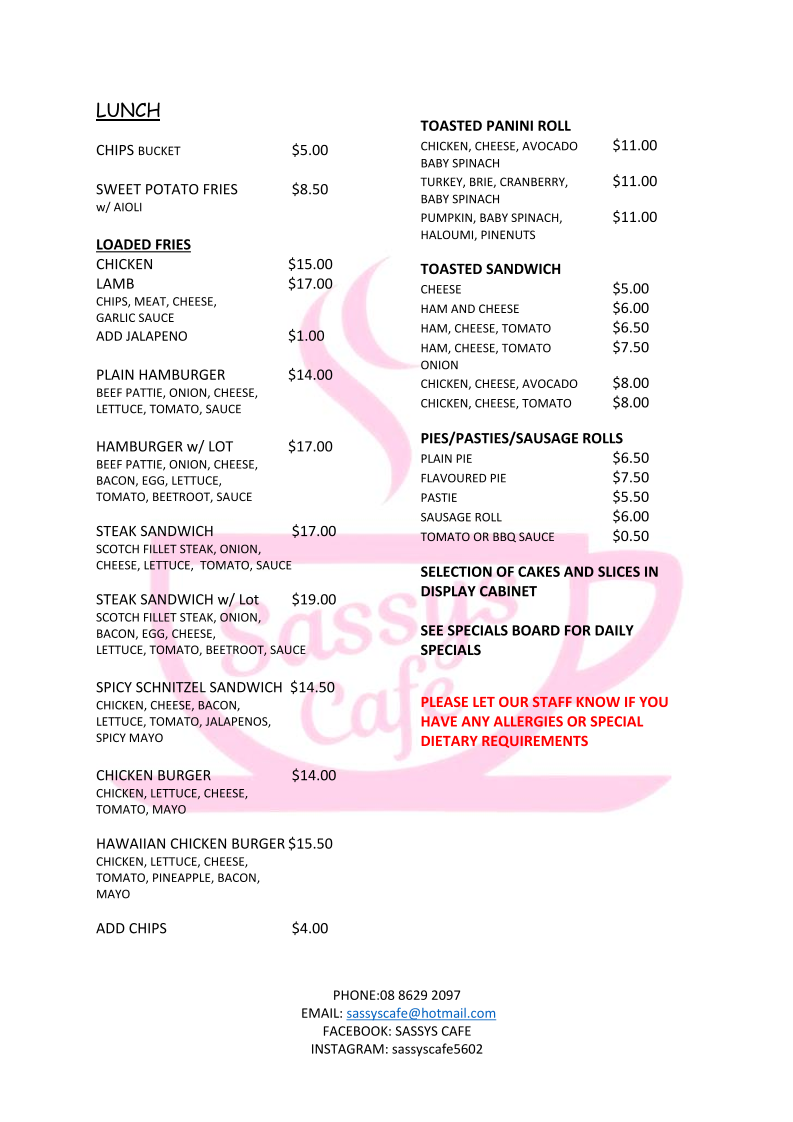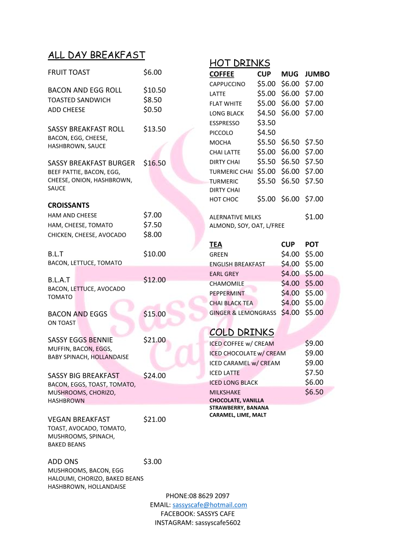 The menu at Sassys Cafe offers a variety of options suitable for breakfast, light meals, and casual dining. It is organized into several categories to help visitors easily find their preferred choices.
